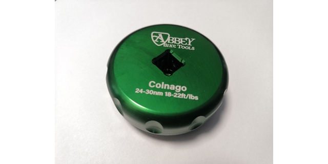 Stahovák ABBEY na misky středového složení COLNAGO (vnější průměr misky 53 mm, 16 drážek). Zakončen 4HR 3/8". Slitina hliníku, ve firemním zeleném odstínu, laserem vypálené logo a doporučený utahovací moment (24-30 Nm).