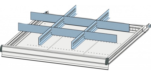 Plechové dělení zásuvky skříně ZB (36x36D), pro čela zásuvek výšky 75 mm, příčná hradítka z hliníkového plechu tl. 1,5 mm, štěrbinové dělení z pozinkovaného plechu, 9 polí.